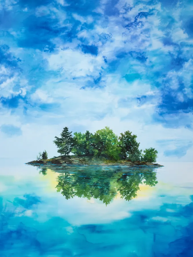 This watercolor painting features a small leafy island floating quietly on glassy blue water, perfectly reflected below. Fresh greens and deep teals shape the trees, while the sky is painted in soft layers of blue and white with loose cloud textures drifting across. The brush strokes feel light and fluid, especially in the water where reflections gently blur and blend. The composition is simple and centered, which gives the whole scene a calm balanced feeling and lets the colors breathe without feeling busy.