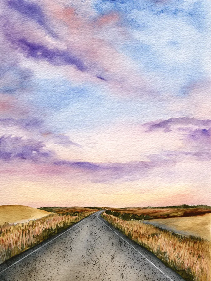 I love painting scenes like this because they feel peaceful and a little nostalgic. The straight road makes the composition easy, which lets you focus on color and mood instead of detail. If you enjoy quiet landscapes that feel slow and reflective, this one is such a pleasure to try. I find it really relaxing to build the sky first and then let the rest fall into place without overthinking it.
