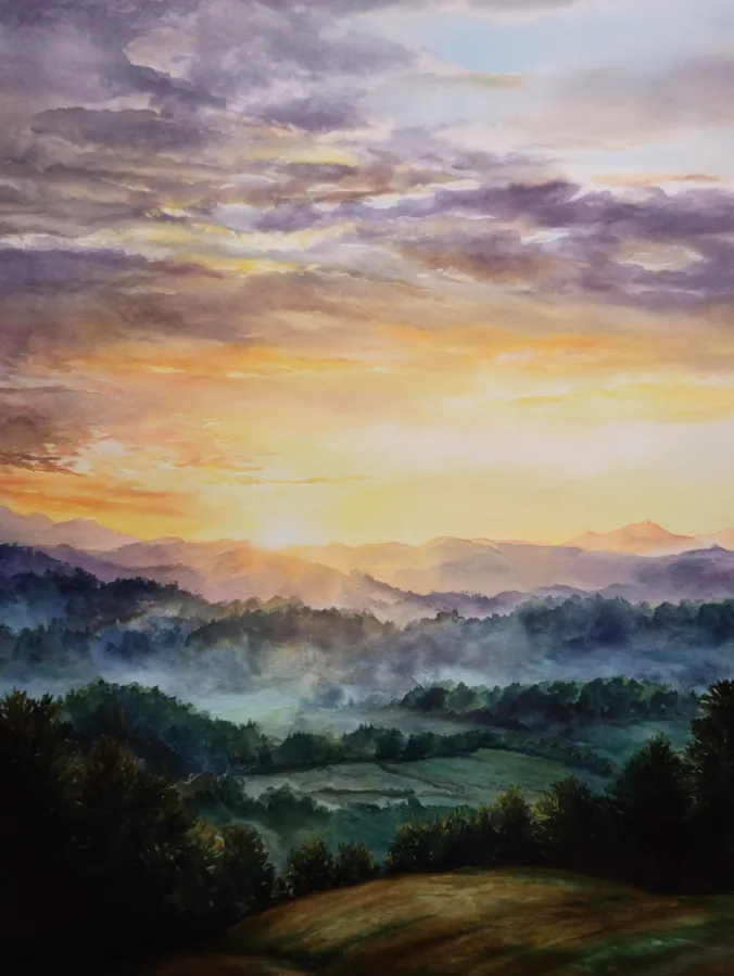 This watercolor painting shows layers of soft green hills fading into the distance under a glowing sunrise sky. Warm yellows and gentle peach tones light up the horizon, while muted purples and grays drift through the clouds above. The brush strokes feel loose and atmospheric, especially in the mist that settles between the hills and trees. The foreground stays darker and grounded, which helps guide the eye naturally toward the brighter sky and creates a calm sense of depth across the whole scene.