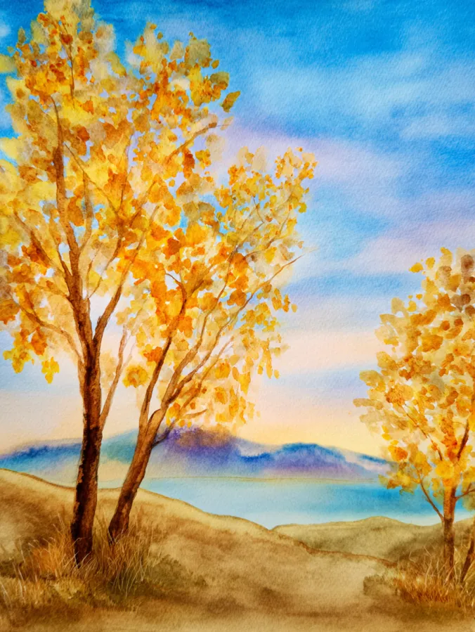 This watercolor painting features tall autumn trees glowing with warm golden leaves beside a calm lake. Rich yellows and soft oranges fill the trees, while gentle blues and pale purples shape the sky and distant hills. The brush strokes feel light and playful in the leaves, giving them a soft fluttering look, while the ground and water stay smooth and grounded. The composition feels balanced and open, with the trees framing the peaceful water and pulling the eye gently across the scene.