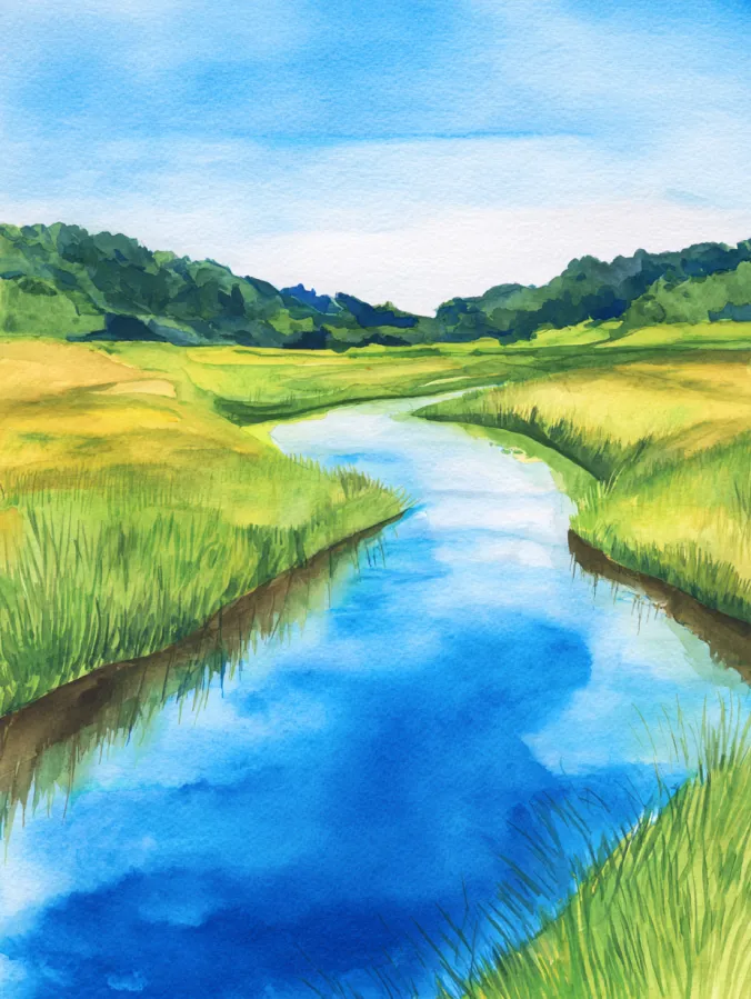 This watercolor painting shows a gentle river curving through bright green fields under a clear blue sky. Fresh greens and sunny yellows shape the grasses, while the water reflects soft blues with smooth flowing washes. The brush strokes are loose and easy, especially along the riverbanks where grasses blend softly into the land. The composition naturally guides the eye along the curve of the river, creating a calm sense of movement and depth without feeling busy.