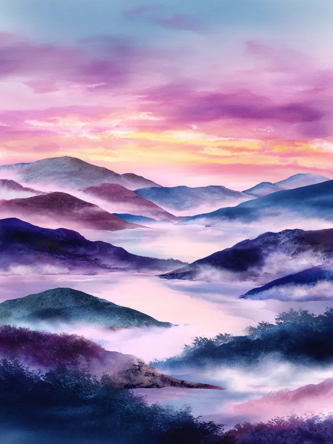 This watercolor painting shows layered mountains rising gently above a calm lake wrapped in soft mist. Cool blues and muted purples shape the hills, while warm pinks and peach tones glow across the early morning sky. The brush strokes feel smooth and blended, especially in the mist where colors fade softly into one another. The composition flows naturally from the darker foreground shapes into lighter distant layers, creating a peaceful sense of depth and quiet stillness.