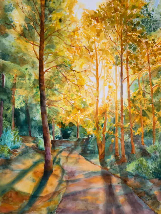 This watercolor painting captures a peaceful forest path bathed in warm sunlight filtering through tall trees. Golden yellows and soft greens fill the leaves, while earthy browns and cool shadows shape the ground below. The brush strokes feel loose and layered, especially in the foliage where dabs of color create a glowing canopy effect. Long soft shadows stretch across the path, guiding the eye forward and giving the whole scene a calm sense of depth and movement.