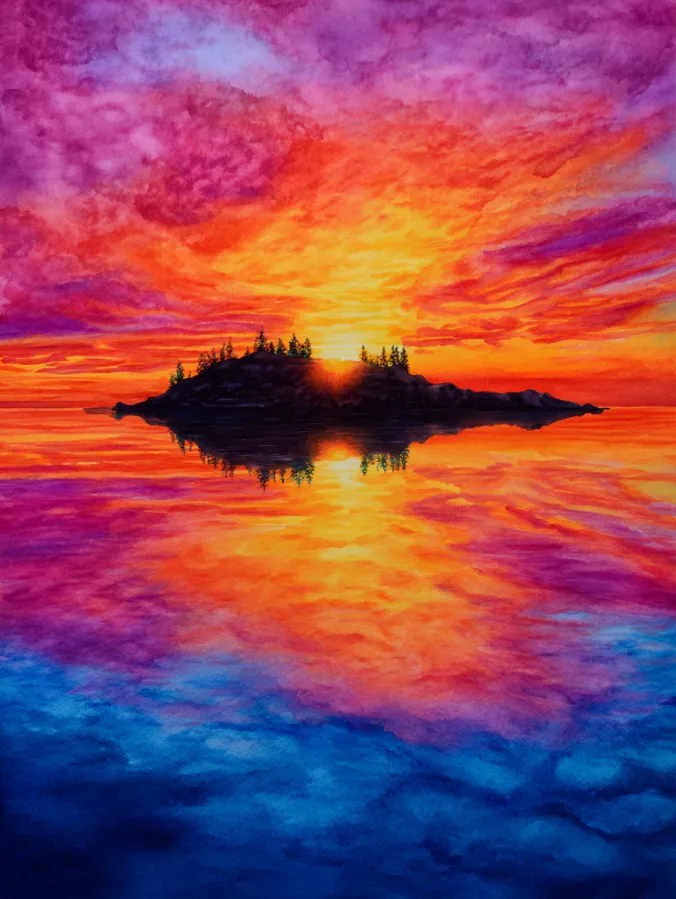 This watercolor painting shows a glowing sunset hovering just above a small island, perfectly mirrored in calm water below. Fiery oranges and golden yellows burst from the center, fading into rich pinks, purples, and deep blues toward the edges. The brush strokes feel soft and layered, especially in the sky where colors blend in dreamy waves. The island and trees stay dark and simple, creating a strong silhouette that anchors the whole composition while the reflection adds that satisfying sense of balance and calm.