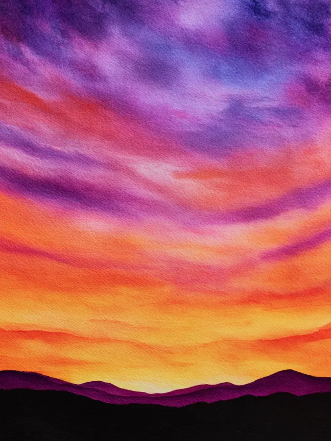 This watercolor painting focuses on a dramatic sunset sky filled with bold layers of orange, coral, pink, and deep purple. The colors flow smoothly into one another with soft blended brush strokes that give the sky a rich glowing texture. Along the bottom, dark mountain silhouettes keep the composition grounded and simple, letting the vibrant sky take center stage. The overall layout feels calm and powerful at the same time, with plenty of open space to enjoy the movement of color.