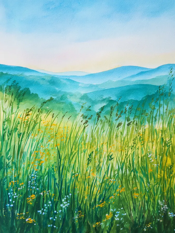This watercolor painting captures a soft green meadow filled with tall grasses and tiny wildflowers swaying gently in the foreground. Fresh greens and sunny yellows dominate the field, while soft blues and teals layer the rolling hills in the distance. The sky stays light and airy with pale washes that keep the focus on the land below. Brush strokes are loose and flowing, especially in the grasses where thin vertical lines create movement and a breezy feel. The overall composition feels open and peaceful, with plenty of space to let the scene breathe.