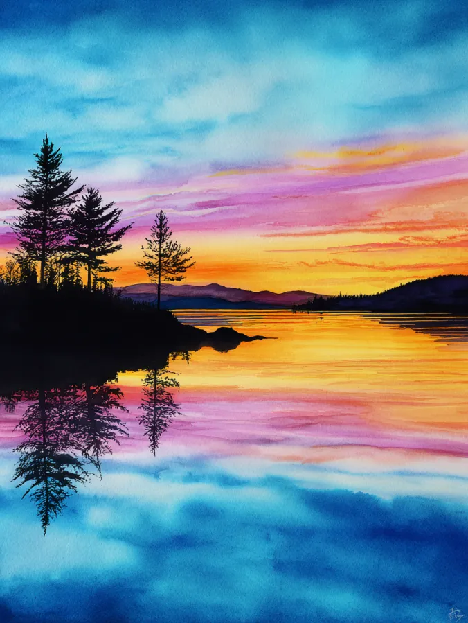 This watercolor painting shows a glowing sunset reflected across a calm lake, with dark pine trees standing quietly along the shore. Warm oranges and soft golds spread across the horizon, blending into pinks and purples before fading into cool blues above. The water mirrors the sky almost perfectly, using smooth flowing brush strokes that create a glassy peaceful surface. The trees stay bold and simple, grounding the composition and giving the bright colors space to shine.