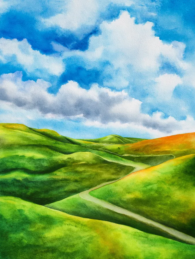 This watercolor painting shows bright green rolling hills stretching across the landscape beneath a sky filled with fluffy white clouds. Fresh greens and soft yellows shape the hills, with gentle shading that gives them a smooth flowing look. The sky is painted in loose washes of blue and white, with soft cloud edges that keep everything light and airy. A winding path cuts through the hills, guiding the eye naturally through the scene and adding a calm sense of movement.