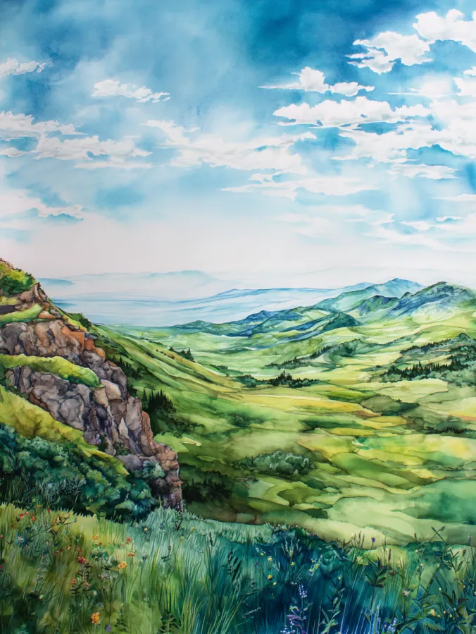 This watercolor painting opens up into a wide green valley filled with rolling hills, layered fields, and soft distant mountains. Fresh greens and sunny yellows flow across the land, while cooler blues and teals settle into the shadows for gentle contrast. The sky feels light and airy with loose cloud shapes drifting through soft washes of blue. Brush strokes stay relaxed and fluid, especially in the grasses and hills, creating a sense of movement without overwhelming detail. The composition leads the eye from the foreground plants all the way to the hazy horizon, which makes the whole scene feel calm and expansive.
