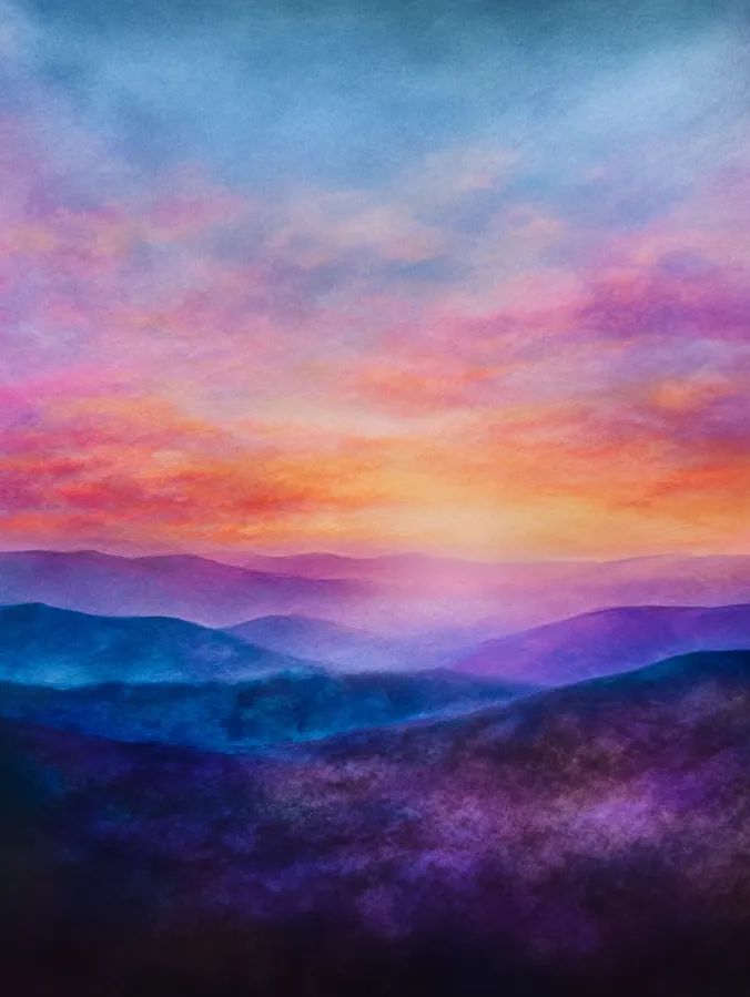 This watercolor painting features gentle layers of distant mountains fading into one another beneath a glowing sunrise sky. Warm peach and soft orange tones sit at the horizon, slowly blending into pinks, purples, and calm blues as the sky stretches upward. The mountains are painted with smooth, flowing washes that overlap slightly, creating depth without sharp edges. Everything feels soft and airy, with blended brush strokes and subtle texture giving the scene a dreamy and peaceful look.
