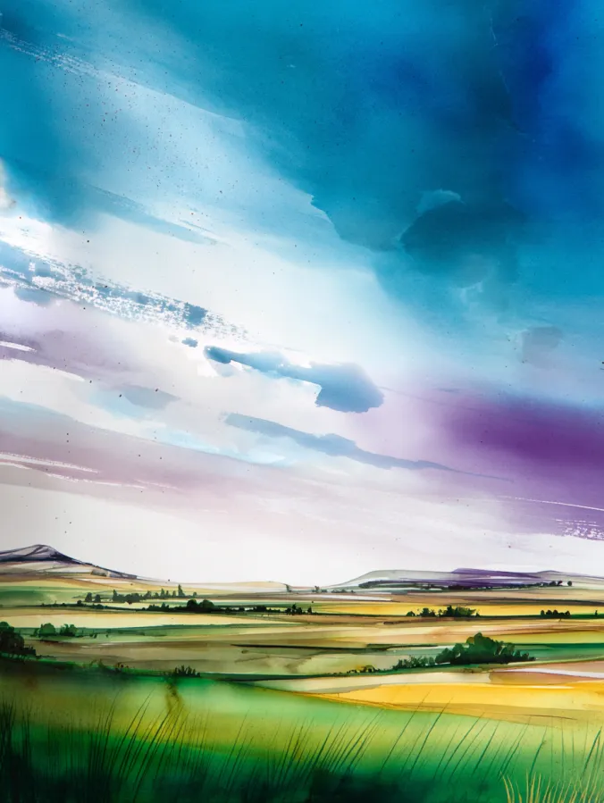 This watercolor painting features wide open fields stretching toward a distant horizon beneath a beautifully expressive sky. Soft greens and warm yellows flow across the land in simple layered shapes, while the sky steals the show with bold washes of teal, blue, lavender, and hints of white. The brush strokes feel loose and confident, especially in the sky where colors blend freely and create a sense of movement. The overall layout keeps the landscape calm and grounded while letting the sky feel big and emotional, which gives the whole piece a peaceful but uplifting vibe.