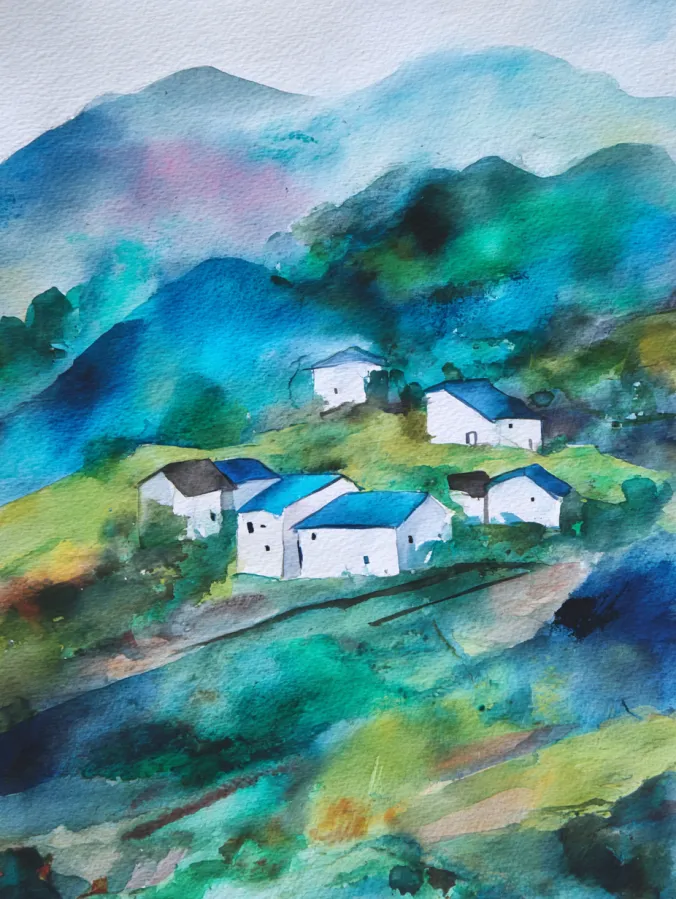 This watercolor painting shows a quiet hillside village tucked into layers of blue green and teal mountains. Small white houses with simple blue rooftops are scattered gently across the slope, creating a cozy focal point against the loose flowing background. The brush strokes feel relaxed and organic, especially in the hills where colors blend and bloom naturally into one another. The overall layout feels airy and balanced, with just enough structure in the houses to contrast beautifully with the soft abstract landscape around them.