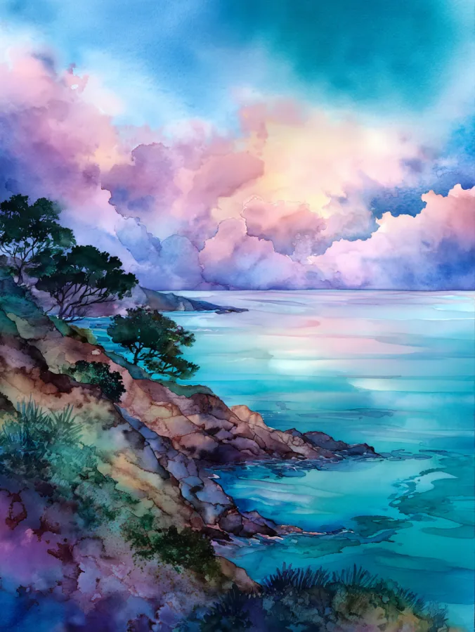 This watercolor painting captures a peaceful coastal scene with soft turquoise water stretching into the distance and rocky cliffs gently framing the shoreline. The sky feels airy and expressive, filled with pastel clouds in blush pinks, lavender, and hints of warm peach that melt into cooler blues above. Brush strokes stay loose and flowing, especially in the clouds and water where colors softly blend and bleed. The composition leads the eye from the textured rocks and trees in the foreground out toward the calm open sea, giving the whole piece a soothing and spacious feel.