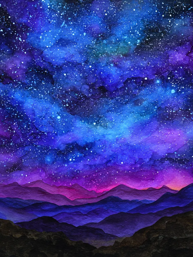 This watercolor painting shows layered mountain silhouettes resting beneath a richly textured night sky filled with stars. Deep blues, indigos, and purples swirl across the sky, dotted with soft white speckles that feel like distant starlight. Near the horizon, gentle pinks and violets glow faintly, adding warmth and depth. The mountains are kept simple and stacked in calm layers, letting the sky take center stage. Brush strokes are loose and expressive, with beautiful blooms and soft textures that give the whole piece a dreamy nighttime mood.