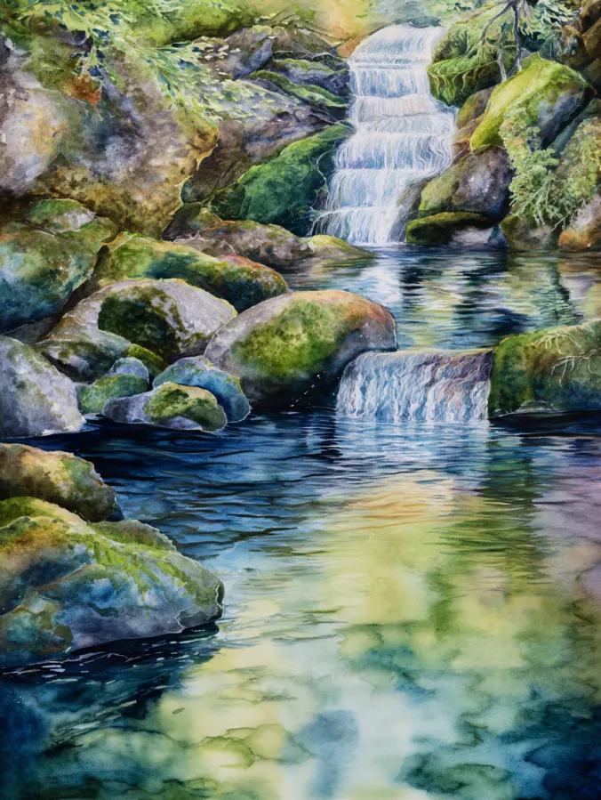 This watercolor painting shows a quiet forest waterfall flowing over mossy rocks into a calm reflective pool below. Cool blues and soft greens dominate the scene, with hints of warm light glowing through the water and leaves. The brush strokes feel layered and fluid, especially in the water where gentle ripples and reflections add depth. The rocks are loosely defined with textured washes, while the greenery blends naturally around them, making the whole composition feel balanced and soothing.
