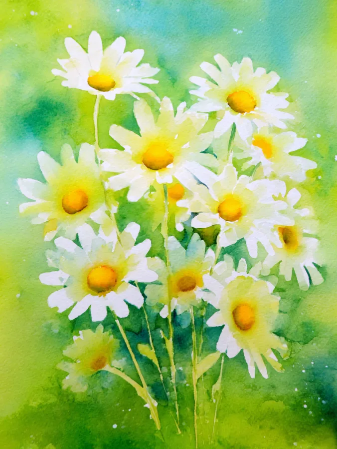 This watercolor painting features a cheerful cluster of white daisies with glowing yellow centers, painted in a loose and airy style. The petals are soft and slightly uneven, created with light brush strokes that let the paper show through for a fresh natural look. Slender green stems gather toward the bottom, while the background melts into vibrant washes of green with hints of blue, giving the whole piece a bright outdoor feel. The composition feels light and open, with the flowers gently overlapping in a relaxed bouquet shape.