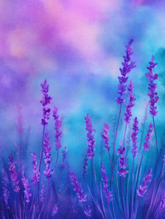 This watercolor painting shows tall lavender stems rising gently from the bottom of the page in soft shades of purple and violet. The flowers are painted with simple upward brush strokes that feel light and airy, letting the stems sway naturally across the composition. The background blends into a smooth wash of turquoise, blue, and lavender, creating a calm dreamy atmosphere that makes the purple blooms stand out beautifully. The overall layout feels open and peaceful, with plenty of space that keeps the scene soft and soothing.