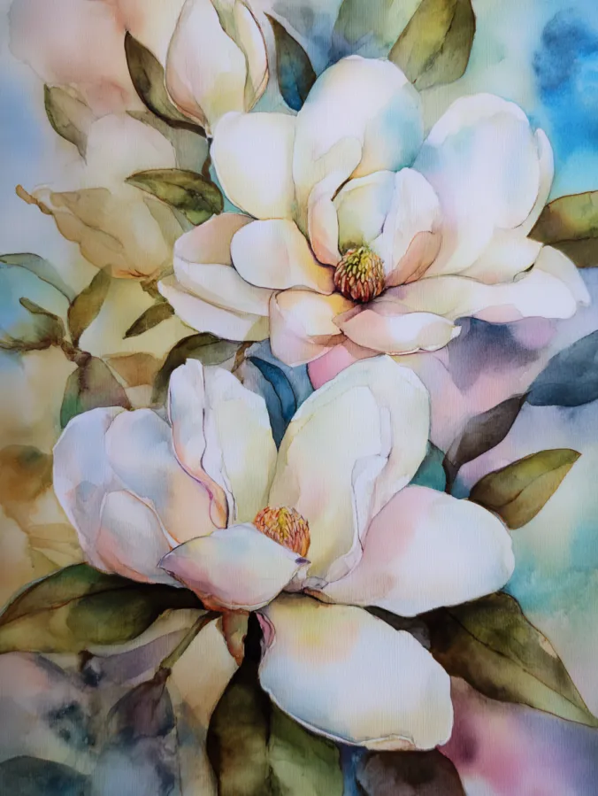 This watercolor painting features large magnolia flowers painted in creamy whites with gentle hints of blush, peach, and pale blue. The petals are broad and smooth, created with soft blended brush strokes that give them a velvety feel. Muted green leaves frame the blooms and fade naturally into a cool pastel background of blues and warm neutrals. The composition feels calm and balanced, with the flowers overlapping slightly to create depth while keeping the overall look light and airy.
