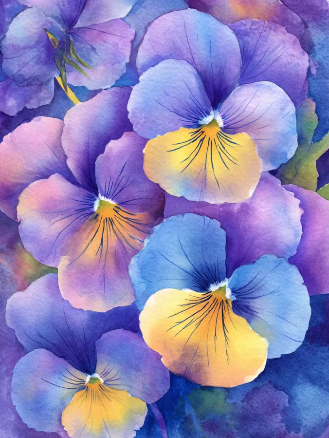 This watercolor painting features overlapping pansy flowers painted in soothing shades of violet, lavender, soft blue, and warm buttery yellow. The petals are rounded and gently blended, with fine brush lines radiating from the centers to add just enough detail without feeling sharp. Colors melt smoothly into one another, creating a velvety layered look that fills the entire canvas. The background stays rich and painterly in deep blues and purples, helping the flowers stand out while keeping the overall mood soft and cohesive.