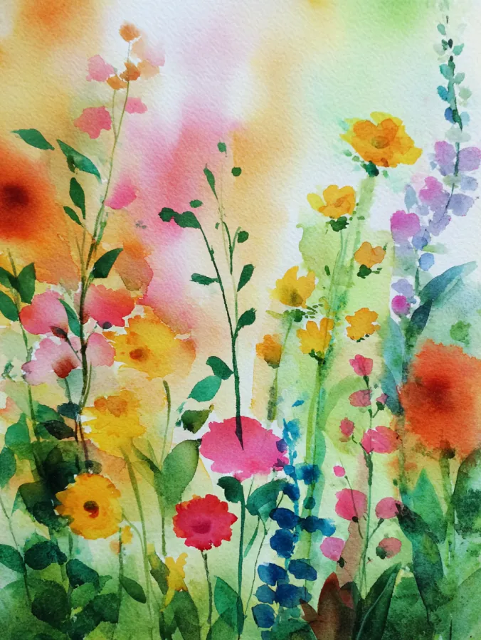 I love painting scenes like this because they feel playful and free. I can experiment with different flower shapes and colors without worrying about getting anything exact. It feels relaxing to let the flowers grow wherever they want on the page. This kind of painting always puts me in a happy creative mood and reminds me that watercolor can be about enjoying the process just as much as the final look.
