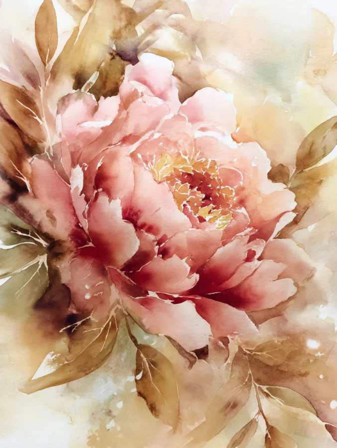 This watercolor painting shows a single lush peony filling most of the canvas, painted in warm blush pinks, soft rose tones, and gentle hints of coral. The petals feel layered and expressive, created with loose flowing brush strokes that blend softly at the edges. Golden yellow details glow at the center, giving the flower a subtle focal point without feeling too sharp. Muted olive and beige leaves surround the bloom, melting into a warm creamy background that feels airy and calm. The overall layout keeps the flower front and center while letting the background washes fade naturally for a soft dreamy look.