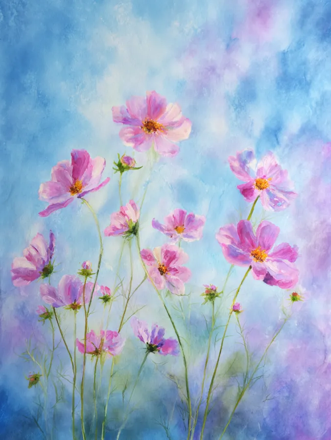 I love painting cosmos like this because they feel effortless and peaceful. I can focus on simple petal shapes and enjoy watching the colors bloom into the background. It feels relaxing to keep everything light and loose without worrying about detail. This kind of painting always makes me feel calm and inspired and it is perfect for quiet creative time when I just want to paint something soft and pretty.