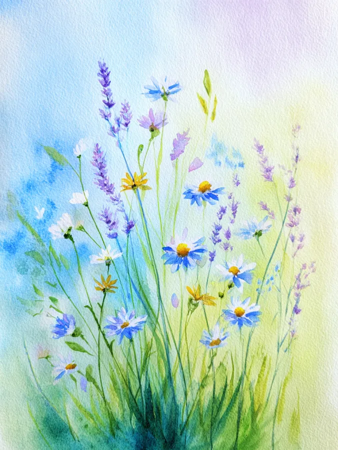 This watercolor painting captures a light and breezy wildflower meadow filled with soft blue daisies, lavender sprigs, and slender green stems reaching upward. The brush strokes are loose and flowing, letting the flowers feel like they are gently swaying rather than perfectly placed. Cool blues and purples mix with fresh greens, while the background fades into a dreamy wash of pale yellow and sky blue. The composition feels open and vertical, with plenty of breathing room that keeps the scene fresh, calm, and softly balanced.