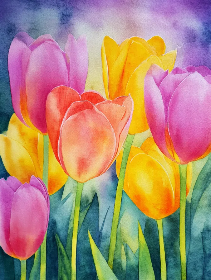 This watercolor painting features a cheerful cluster of tulips standing tall across the page in bright pinks, sunny yellows, and warm coral tones. The petals are softly shaped with smooth blended brush strokes that give each flower a gentle glow. Slender green stems and leaves rise upward and overlap naturally, creating a simple layered look without feeling crowded. The background fades into a dreamy mix of purples and blues, adding contrast while keeping the overall feel light and soft.
