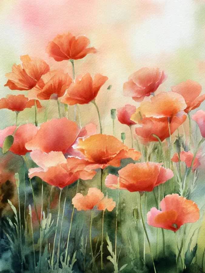 This watercolor painting shows a gentle field of poppies drifting upward across the page in warm coral, peach, and soft red tones. The petals are painted with loose flowing brush strokes that feel light and airy, letting the edges blur naturally into the background. Slender green stems and soft grassy textures rise from the bottom, creating a layered look that feels calm and organic. The background melts into pastel washes of blush, pale yellow, and soft green, giving the whole scene a warm sunlit glow.