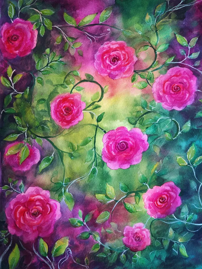 This watercolor painting features bright pink roses scattered across the canvas, connected by curling green vines and delicate leafy branches. The flowers are painted with soft layered brush strokes that give each rose a full rounded look without sharp edges. Rich greens blend with deep teal and purple tones in the background, creating a lush dreamy atmosphere that makes the pink blooms really pop. The composition feels playful and flowing, with vines weaving naturally around the flowers and filling the space in a balanced way.