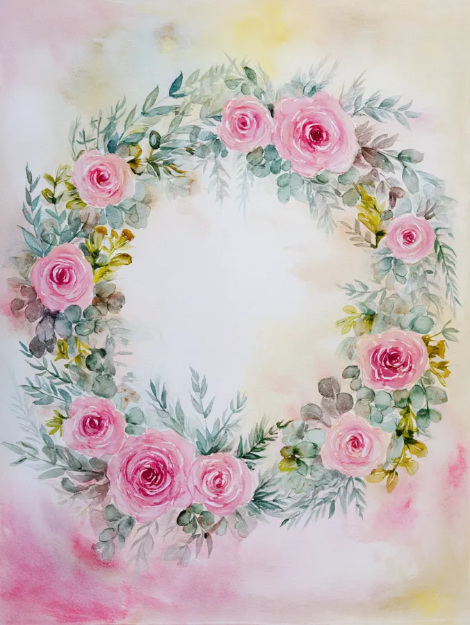 This watercolor painting shows a soft circular wreath made of blush pink roses, silvery green leaves, and gentle eucalyptus style branches. The flowers are painted with loose layered brush strokes that give them a delicate full look without sharp edges. Muted greens and dusty blues mix beautifully with the pink blooms, while the background fades into pale washes of cream, peach, and soft pink. The open center creates a calm balanced layout that feels airy and elegant, perfect for a gentle floral design.