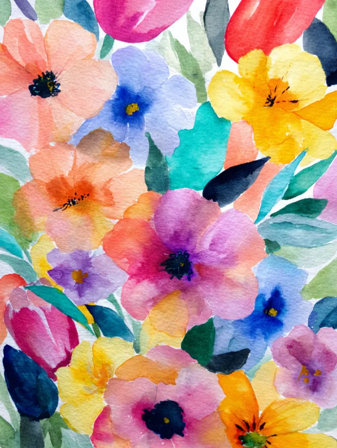This watercolor painting is packed with cheerful flowers scattered across the page in a lively mix of pinks, peaches, yellows, blues, and purples. Each bloom is painted with loose rounded petals and soft blended edges, giving the whole piece a light carefree feel. The brush strokes are simple and expressive, with colors gently bleeding into one another for that classic watercolor softness. Green and teal leaves weave between the flowers, filling the space and creating a full all over pattern that feels energetic but still balanced.