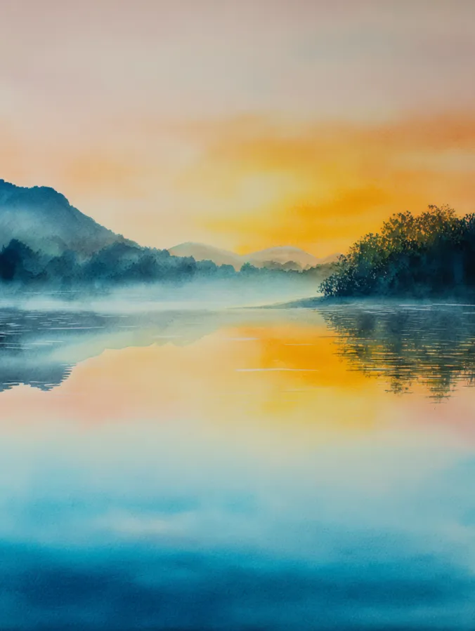 This watercolor design shows a calm lake stretching across the page with gentle reflections of a glowing sunrise. Warm yellows and soft oranges melt into cool blues, creating that peaceful mirror effect on the water. The mountains and trees are kept loose and slightly misty, with blended edges that feel airy and light. Brush strokes are smooth and relaxed, letting the colors bleed naturally into one another for a dreamy, balanced composition that feels open and uncluttered.