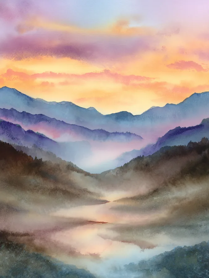 This watercolor painting shows layered mountain ranges fading gently into the distance, painted in soft blues purples and warm earthy tones. The sky glows with peach pink and golden light, blending smoothly into the mountains below. Mist drifts through the valley and over the water, created with light washes and soft edges that keep everything dreamy and calm. The composition flows naturally from top to bottom, with reflections in the water adding balance and a peaceful sense of depth.