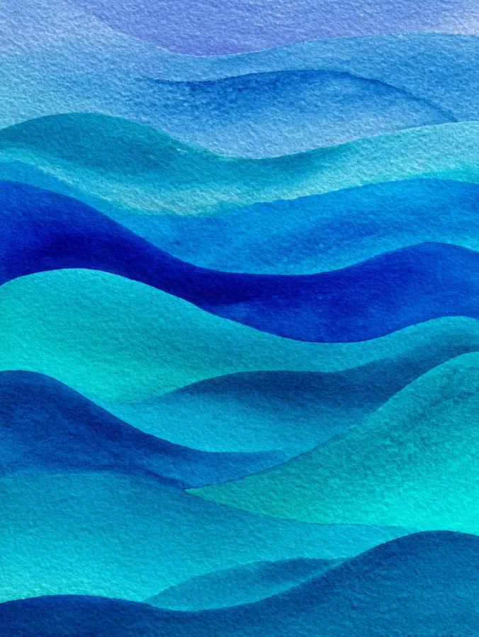 This watercolor painting is made up of soft flowing wave shapes layered across the page in shades of turquoise teal and deep blue. Each band curves gently into the next, creating a smooth rhythmic movement that feels calm and steady. The brush strokes are loose and blended, allowing the colors to melt together while still keeping each layer defined. The entire composition feels balanced and soothing, with the textured paper showing through just enough to add warmth and depth.