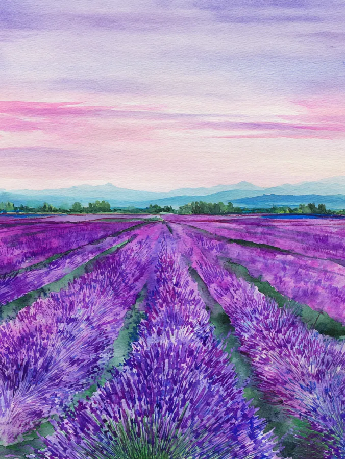This watercolor painting shows endless rows of lavender stretching toward the horizon, painted in rich purples with hints of blue and soft green stems in between. The brush strokes are loose and textured, especially in the foreground, giving the flowers a slightly fuzzy and expressive look. In the distance, the colors soften and fade into gentle hills and a pastel sky filled with pinks and light blues. The composition leads your eye straight through the rows, creating depth while still keeping everything calm and airy.