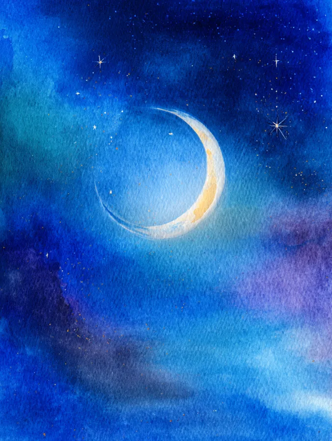 This watercolor painting features a glowing crescent moon floating in a deep night sky filled with layered blues, indigo tones, and soft hints of violet. The background is built with gentle washes that blend smoothly, creating a dreamy galaxy effect without sharp edges. Tiny stars are scattered lightly across the sky, adding sparkle while keeping the composition calm and uncluttered. The moon sits slightly off center, glowing softly and giving the whole piece a peaceful nighttime mood.