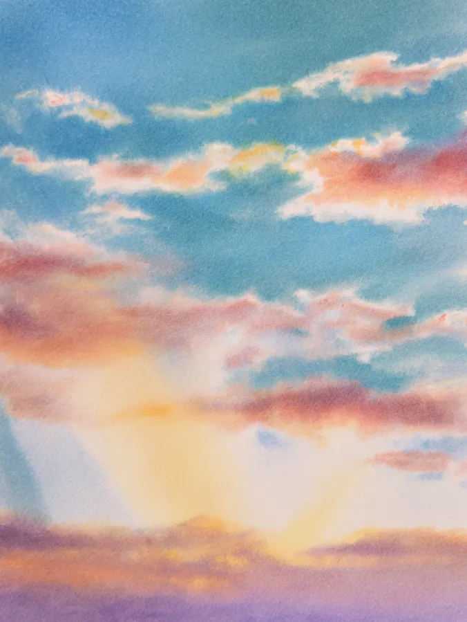 This watercolor painting focuses on a glowing sunset sky painted in blended layers of blue peach pink and warm golden tones. The clouds are soft and wispy, created with gentle brush strokes that let the colors bleed naturally into one another. Light rays peek through the clouds near the horizon, giving the whole piece a calm and hopeful feel. The composition is open and airy, with the sky filling the frame and flowing smoothly from top to bottom.