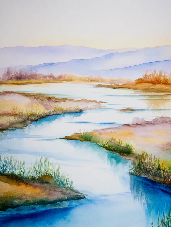 This watercolor painting shows a gentle river winding through a quiet meadow, painted in soft blues, warm browns, and light green grasses. The water flows smoothly with loose horizontal strokes, while the grassy banks are suggested with simple upward brush marks that keep everything light and natural. In the distance, hazy hills fade into pale blue and lavender tones, giving the scene a peaceful sense of depth. The composition feels open and balanced, with the river guiding your eye calmly through the landscape.
