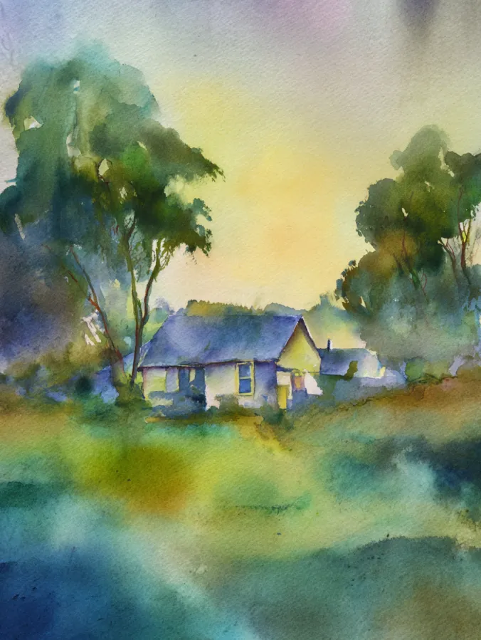 This watercolor painting shows a small cottage nestled among tall trees, painted in soft greens, gentle blues, and warm golden light. The brush strokes are loose and blended, especially in the foliage, which gives the scene a dreamy and slightly blurred look. The house itself is simple and softly defined, allowing it to blend naturally into the landscape rather than stand out sharply. The composition feels calm and balanced, with the trees framing the cottage and leading your eye gently toward the center.