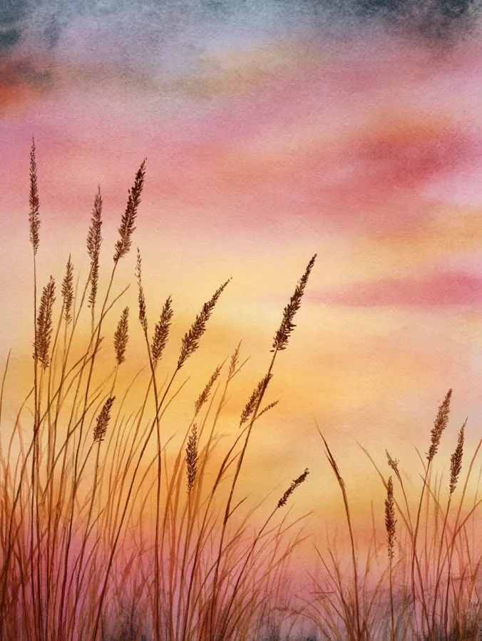 This watercolor painting shows tall delicate grasses rising softly against a warm sunset sky filled with peach pink and gentle golden tones. The background is painted with smooth blended washes that fade naturally into one another, creating a calm glowing atmosphere. The grasses are suggested with thin loose brush strokes that feel light and airy rather than detailed. The composition is simple and elegant, with the grasses placed off center and reaching upward, giving the whole scene a quiet and peaceful flow.