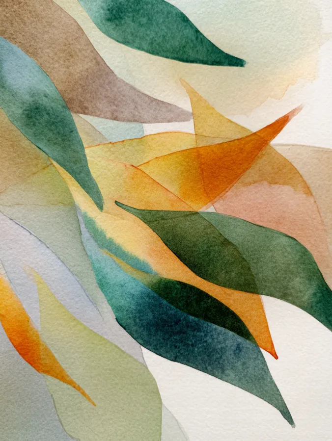 This watercolor painting features layered leaf shapes drifting across the page in soft greens warm ochres muted teal and gentle beige tones. The shapes overlap and blend with smooth washes, creating a light sense of movement without sharp edges. Brush strokes are loose and fluid, allowing the colors to softly bleed where they meet. The composition feels airy and balanced, with plenty of open space that keeps the design calm and visually soothing.