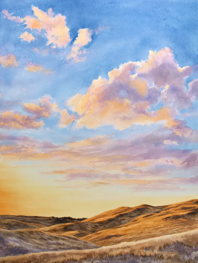 This watercolor painting features rolling golden hills stretching across the lower half of the page, painted with soft layered washes that gently follow the curves of the land. Above them, a wide open sky takes center stage, filled with fluffy clouds in blush pinks, warm peaches, and hints of lavender against a calm blue backdrop. The brush strokes feel loose and airy, especially in the clouds, while the hills are grounded with subtle texture and smooth color transitions that keep the whole scene feeling peaceful and balanced.