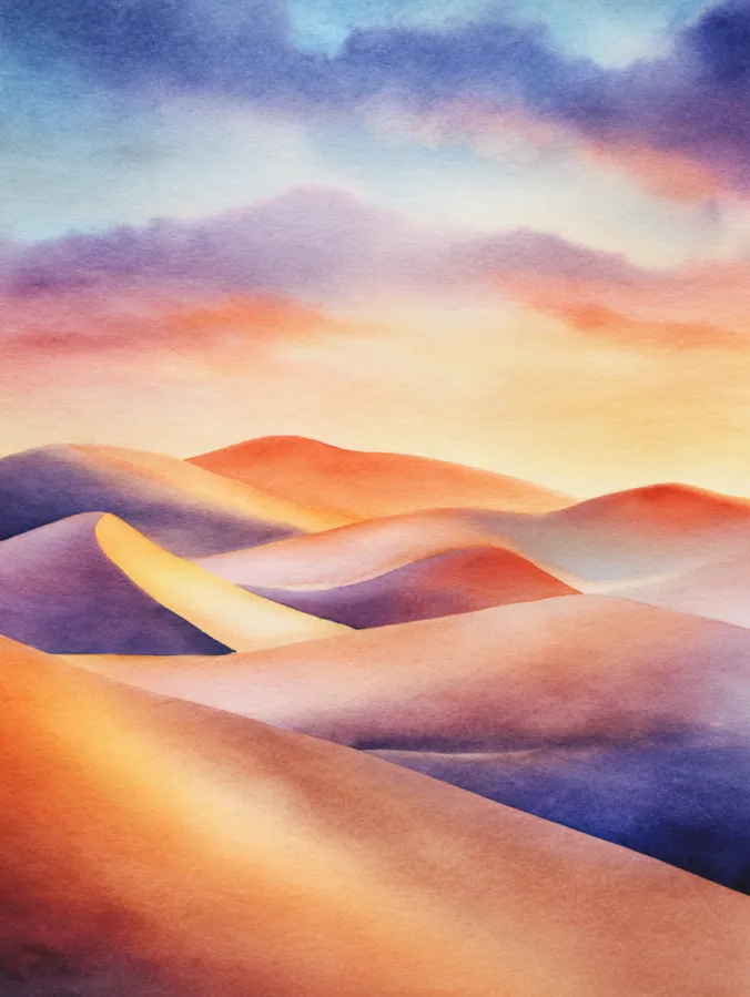 This watercolor painting shows gentle rolling desert dunes layered across the page in warm peachy sand tones mixed with soft purples and calming blues. The brush strokes are smooth and blended, following the curves of the dunes and giving them a soft flowing look. The sky above fades gently from golden light into cooler shades, adding balance and depth to the composition. Everything feels calm and spacious, with simple shapes and smooth transitions that keep the scene peaceful.