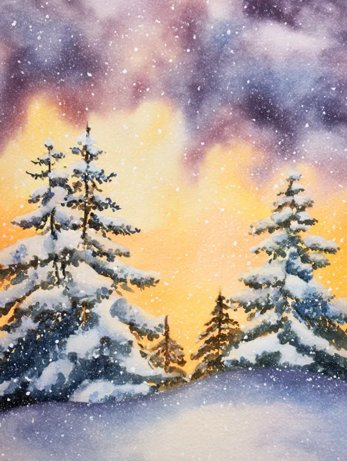 This watercolor painting shows snow covered pine trees standing quietly under a glowing winter sky. Soft blues and cool purples shape the trees and snow, while warm golden and peach tones light up the sky behind them. The brush strokes are loose and textured, especially in the trees, giving them a fluffy snow dusted look without sharp detail. Gentle white splatters suggest falling snow and add a dreamy touch to the scene. The composition feels cozy and balanced, with the trees framing the warm sky at the center.