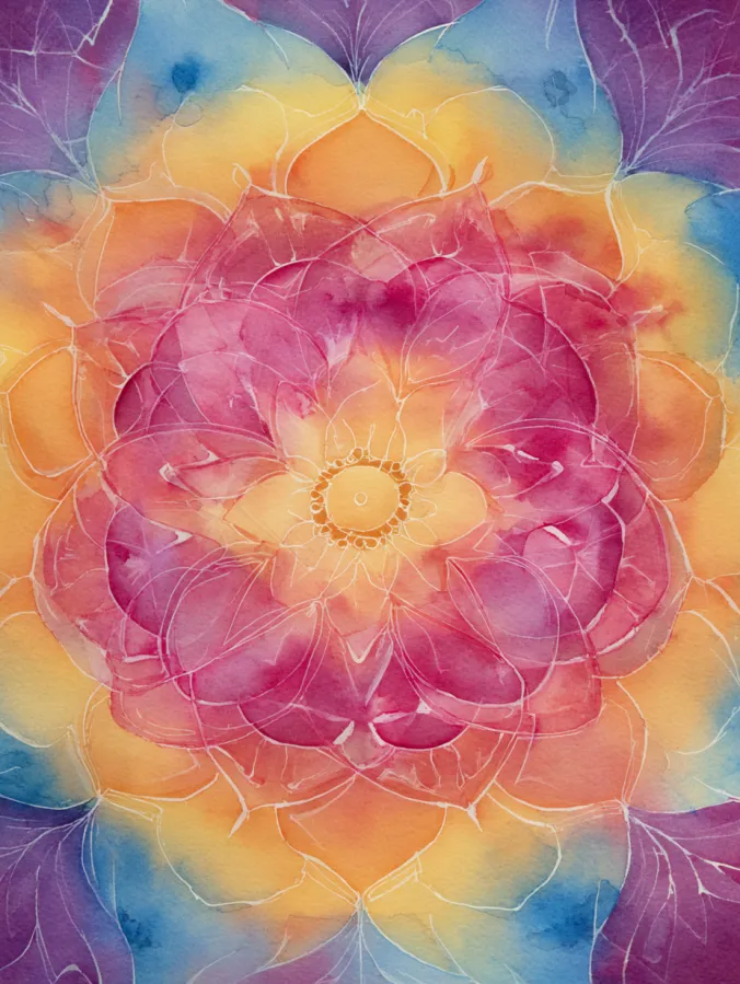 This watercolor painting features a symmetrical mandala style flower radiating outward in layers of pink coral golden yellow and soft blue. The petals overlap gently with translucent washes, creating a glowing effect where the colors meet. Fine white line details trace the petal shapes and add a delicate structure without making the design feel heavy. The composition is centered and balanced, with smooth blends and soft edges that keep the overall look calm and harmonious.