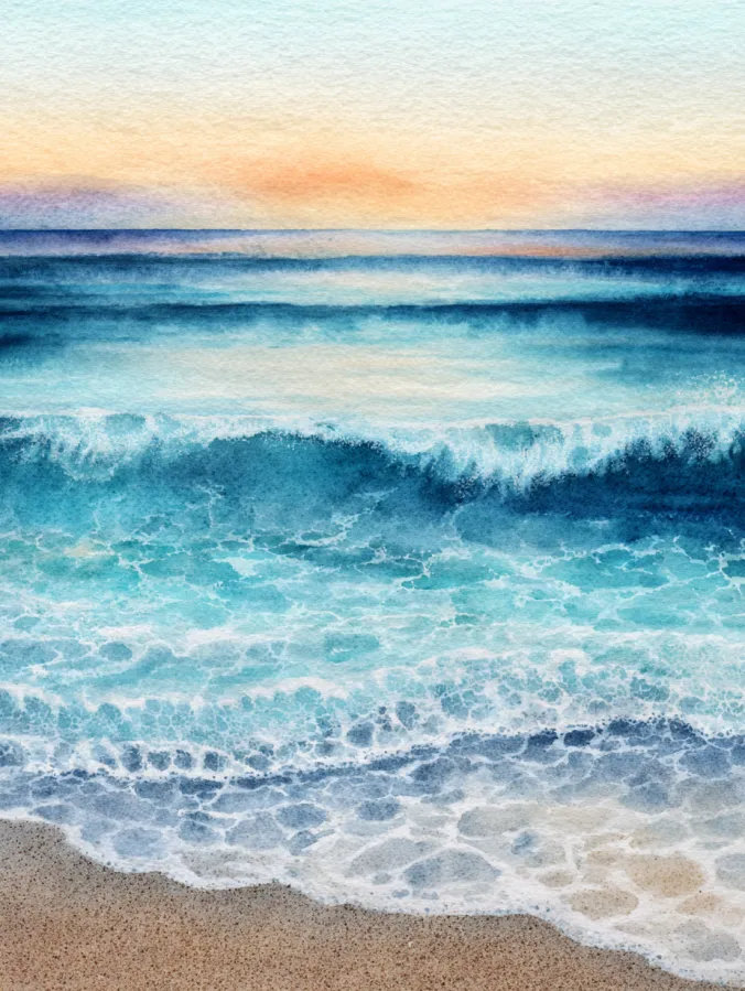 This watercolor painting captures soft waves rolling toward the shore, layered in calming shades of turquoise, teal, and deep blue. The water is painted with loose horizontal strokes that blend smoothly into one another, creating a natural sense of movement without feeling busy. Near the horizon, the sea melts into a warm pastel sky with hints of peach and lavender, while the foamy shoreline adds light texture and contrast at the bottom of the composition. The overall layout feels balanced and airy, with plenty of breathing room for the colors to shine.