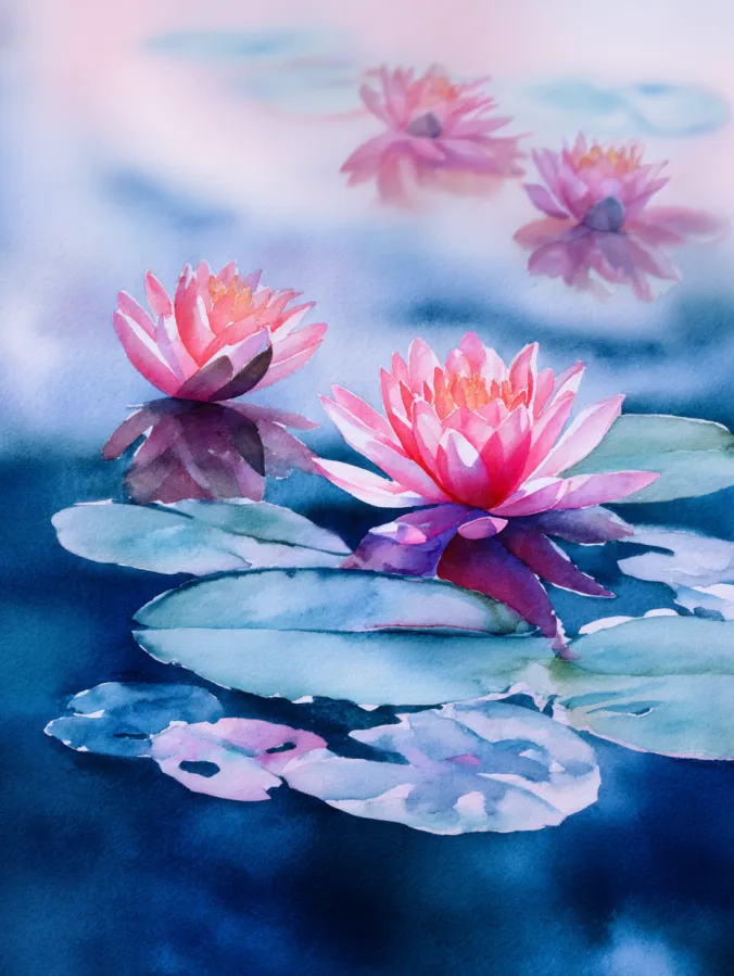 This watercolor painting features soft pink lotus flowers floating gently on deep blue water, surrounded by loose lily pads painted in muted greens and soft teal tones. The petals are layered with light to dark washes that give each flower a delicate glow, while the water is kept fluid and dreamy with blended brush strokes and subtle reflections. The composition feels calm and spacious, with the flowers spaced naturally across the page and the background fading softly to create depth without feeling busy.