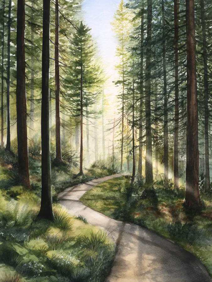 This watercolor painting shows a winding path gently curving through a tall forest filled with soft green tones and warm sunlight. The trees are painted with loose vertical strokes that feel light and natural, while the leaves and grass are layered with subtle washes to create depth without too much detail. Sunlight filters through the trees in pale yellow and cream, creating a calm glow that leads your eye down the path. The overall layout feels inviting and peaceful, with a nice balance between light and shadow.