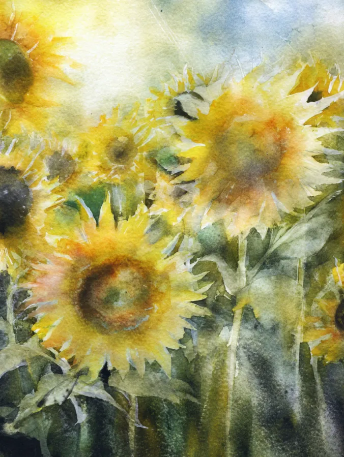 This watercolor painting is filled with loose cheerful sunflowers painted in warm yellows and soft golden tones, surrounded by layered greens that fade gently into the background. The petals are painted with relaxed brush strokes that feel light and feathery, letting the color bleed naturally at the edges. The flower centers are kept slightly textured and imperfect, which adds charm without making the piece feel busy. Everything blends together in a dreamy way, creating a full and lively composition that still feels calm and inviting.